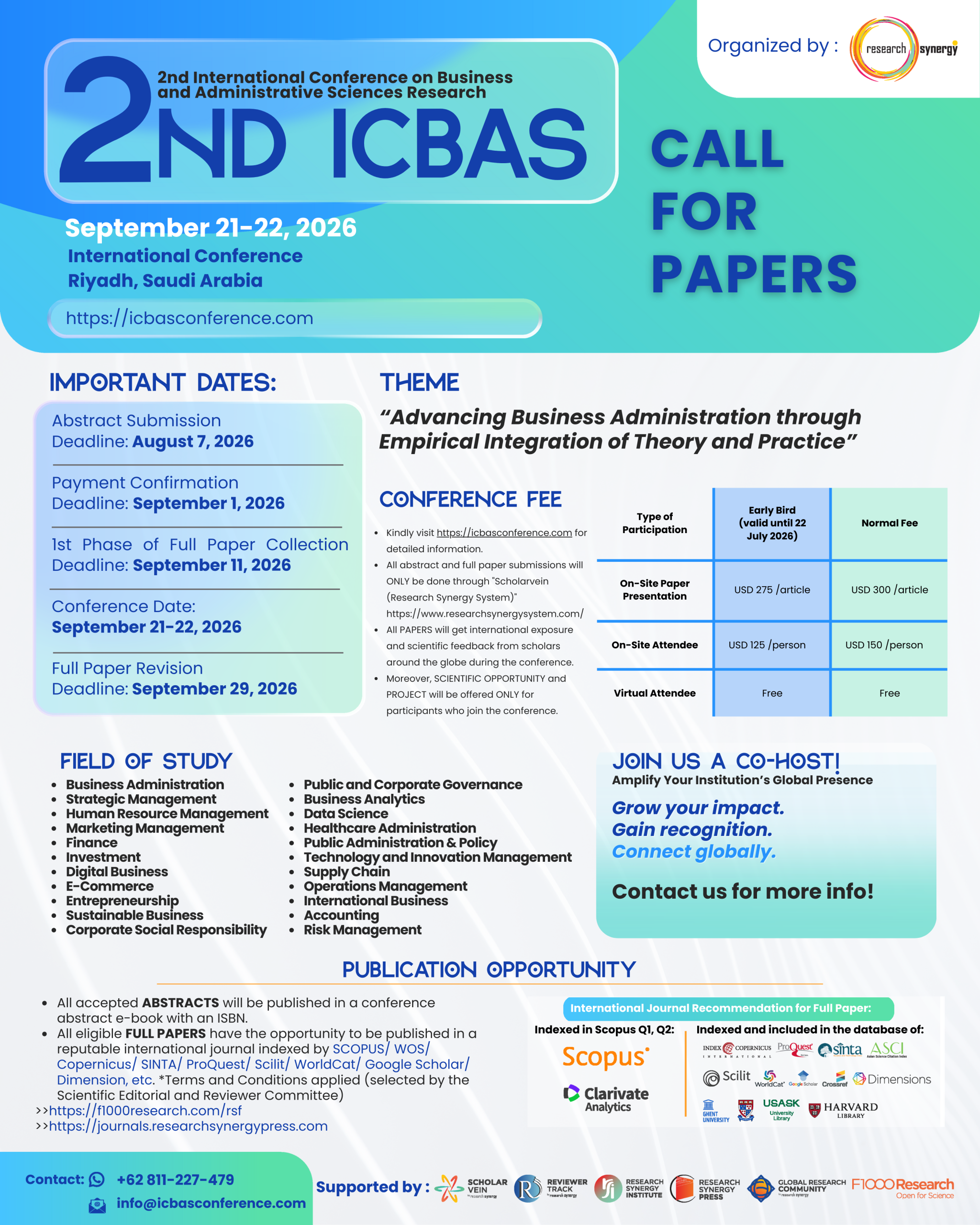 The 2nd International Conference on Business and Administrative Sciences Research (2nd ICBAS) is an academic conference organized by the Research Synergy Foundation and supported by Scholarvein, Reviewer Track, Research Synergy Institute, Research Synergy Press, Global Research Community, and F1000Research. This conference aims to provide a dynamic platform for the advancement of knowledge, collaboration, and the exchange of ideas in the fields of business and administrative sciences. Through this event, we strive to foster academic excellence, cross-disciplinary discussions, and global research engagementt.