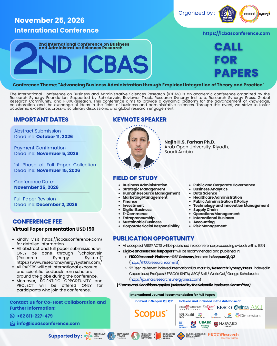 The 2nd International Conference on Business and Administrative Sciences Research (2nd ICBAS) is an academic conference organized by Research Synergy Foundation, and Politeknik Negeri Semarang (Polines) and supported by Scholarvein, Reviewer Track, Research Synergy Institute, Research Synergy Press, Global Research Community, and F1000Research. This conference aims to provide a dynamic platform for the advancement of knowledge, collaboration, and the exchange of ideas in the fields of business and administrative sciences. Through this event, we strive to foster academic excellence, cross-disciplinary discussions, and global research engagementt.